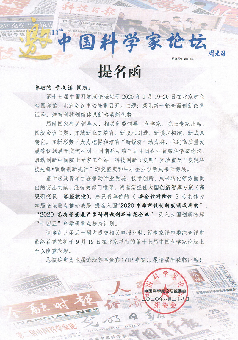 2020年9月19日,万象城平台,万象城(中国)机械技术骨干,被【中国科学家论坛】诚邀担任大国创新智库专家(研究员、客座教授),参加第十七届科学家论坛会议,我公司的《安全性升降机》作为本届重点推介成果,并被提名入围“2020中国科技发明成果奖”“2020高质量发展产学研科技创新示范企业”列入大国创新智库“十四五”产学研重点扶持计划,论坛当日各位代表被邀请上台演讲,并被采访,并一致表示在今后的技术方面还会有更多的提升!这是企业的荣誉,企业的专注、,更是企业的实力。